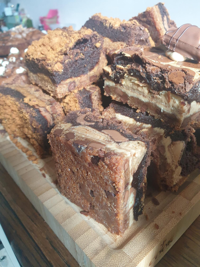 A layer of chocolate chip cookie underneath a thick layer of our Kinderella Sauce, all topped off with a layer of our fudgy brownie - delicious πŸ˜‹