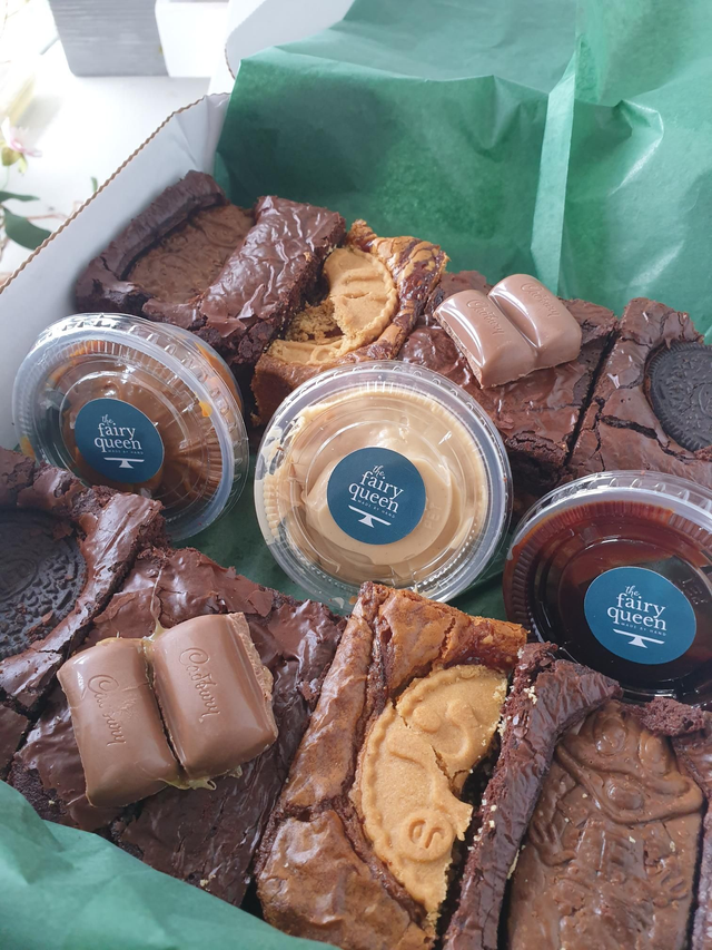 A mix of 8 of our chewy, fudgy chocolate brownies with a dipping pot of Kinderella, Caramel Sauce and Nutella. Great to share for a Netflix and chill evening, the Christmas vibes at the office or a tasty gift.