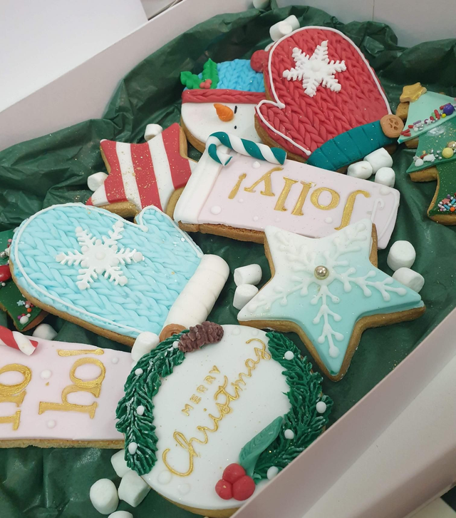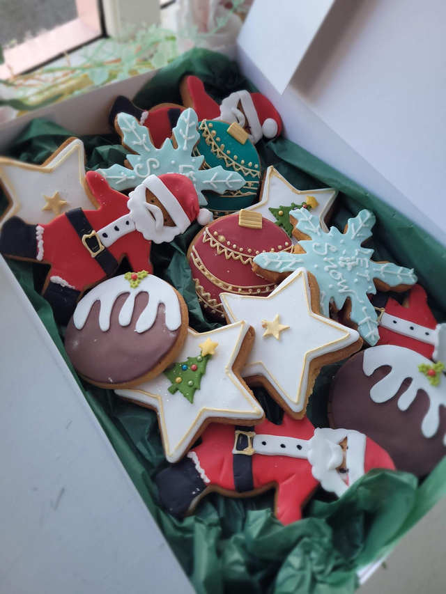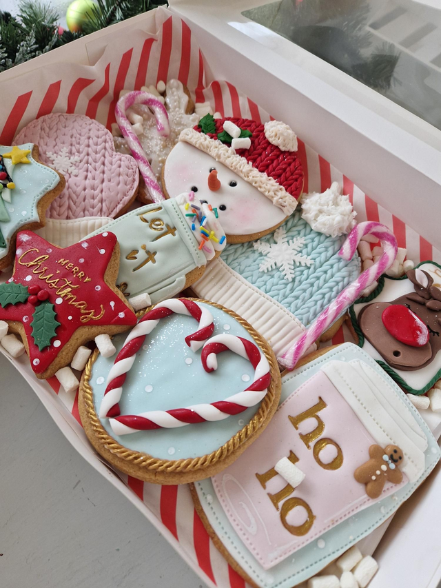 The classic Christmas gift in cookie form! 10 hand decorated buttery sugar cookies, in a display box, perfect for gifting.